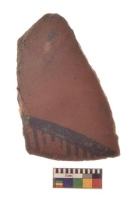 | Description / विवरण | Specimen of Potsherd black on red painted pottery. linear pattern |