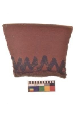 | Description / विवरण | Specimen of Potsherd black on red painted pottery. It is fine fabric in sharp contrast with painted design are executed in black pigment. |