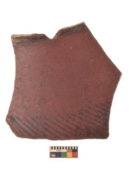 | Description / विवरण | Specimen of Potsherd black on red painted pottery. linear pattern |