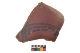 | Description / विवरण | Specimen of Potsherd black on red painted pottery. It is fine fabric in sharp contrast with painted design are executed in black pigment. |