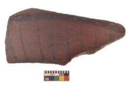 | Description / विवरण | Specimen of Potsherd black on red painted pottery. linear pattern |