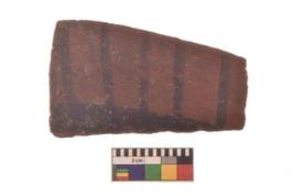 | Description / विवरण | Specimen of Potsherd black on red painted pottery. linear pattern |