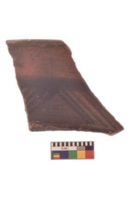 | Description / विवरण | Specimen of Potsherd black on red painted pottery. linear pattern |