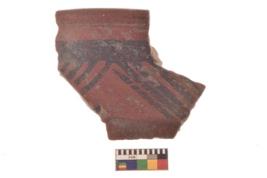 | Description / विवरण | Specimen of Potsherd black on red painted pottery. linear pattern |