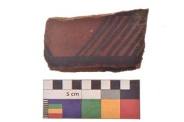 | Description / विवरण | Specimen of Potsherd black on red painted pottery. linear pattern |