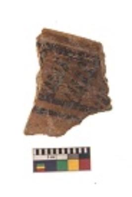 | Description / विवरण | Specimen of black on red ware with black decorative Vertical lines and row of arcs with short vertical strokes geometric painting. |