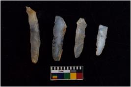 | Description / विवरण | Specimen of flakes tool with prominent flaking marks. It made up of a short flakes with sides trimmed. |
