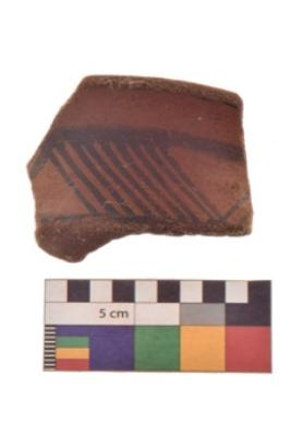 | Description / विवरण | Specimen of Potsherd black on red painted pottery. linear pattern |