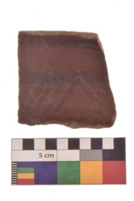 | Description / विवरण | Specimen of Potsherd black on red painted pottery. linear pattern |