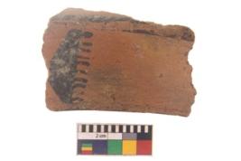 | Description / विवरण | Specimen of black on red ware with black decorative Triangles with strokes geometric painting. |