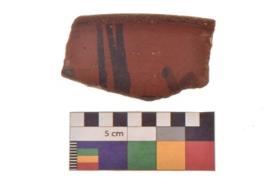 | Description / विवरण | Specimen of Potsherd black on red painted pottery. It is fine fabric in sharp contrast with painted design are executed in black pigment. |