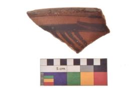 | Description / विवरण | Specimen of Potsherd black on red painted pottery. linear pattern |