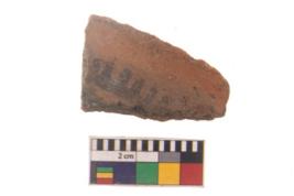 | Description / विवरण | Specimen of black on red ware with black decorative Row of arcs with short vertical strokes geometric painting. |