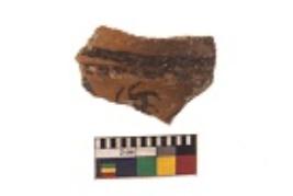 | Description / विवरण | Specimen of black on red ware with black decorative Horizontal lines and circle with lines geometric painting. |
