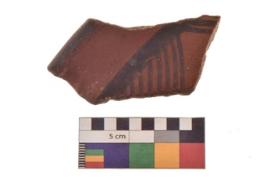| Description / विवरण | Specimen of Potsherd black on red painted pottery. linear pattern |
