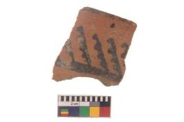| Description / विवरण | Specimen of black on red ware with black decorative Lines with strokes geometric painting. |