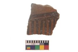 | Description / विवरण | Specimen of black on red ware with black decorative Horizontal and vertical lines geometric painting. |