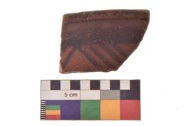 | Description / विवरण | Specimen of Potsherd black on red painted pottery. linear pattern |