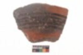 | Description / विवरण | Specimen of black on red ware with black decorative Lattice design between two parallel lines geometric painting. |