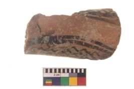 | Description / विवरण | Specimen of black on red ware with black decorative Lattice pattern geometric painting. |