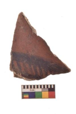 | Description / विवरण | Specimen of Potsherd black on red painted pottery. linear pattern |