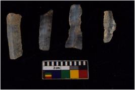 | Description / विवरण | Specimen of flakes tool with prominent flaking marks. It made up of a short flakes with sides trimmed. |