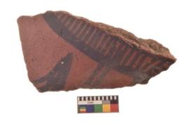 | Description / विवरण | Specimen of Potsherd black on red painted pottery. It is fine fabric in sharp contrast with painted design are executed in black pigment. |