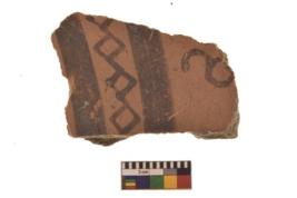 | Description / विवरण | Specimen of Potsherd with black decorative geometric diamond set broad horizontal bands painting |