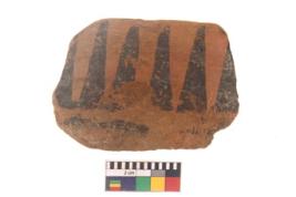 | Description / विवरण | Specimen of black on red ware with black decorative Group of elongated vertical triangles geometric painting. |