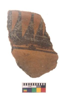 | Description / विवरण | Specimen of black on red ware with black decorative Group of elongated vertical triangles geometric painting. |