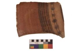 | Description / विवरण | Specimen of Potsherd black on red painted pottery. It is fine fabric in sharp contrast with painted design are executed in black pigment. |