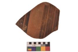 | Description / विवरण | Specimen of Potsherd black on red painted pottery. It is fine fabric in sharp contrast with painted design are executed in black pigment. |