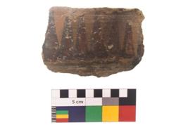 | Description / विवरण | Specimen of black on red ware with black decorative Group of elongated vertical triangles geometric painting. |