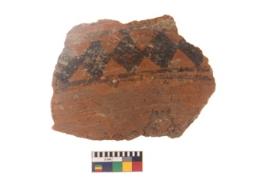 | Description / विवरण | Specimen of black on red ware with black decorative Broad diamond like design geometric painting. |