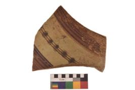 | Description / विवरण | Specimen of Potsherd black on red painted pottery. It is fine fabric in sharp contrast with painted design are executed in black pigment. |