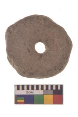 | Description / विवरण | Specimen of a thick wheel broad at circumference and with prominent hubs on both sides |