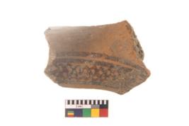 | Description / विवरण | Specimen of black on red ware with black decorative Lattice design geometric painting. |