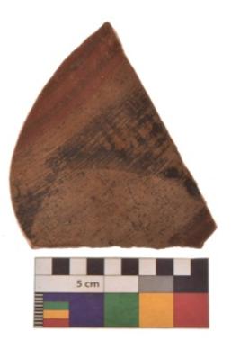 | Description / विवरण | Specimen of Potsherd with black decorative geometric diamond set broad horizontal bands painting |