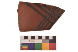 | Description / विवरण | Specimen of Potsherd black on red painted pottery. linear pattern |