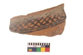 | Description / विवरण | Specimen of black on red ware with black decorative Lattice pattern geometric painting. |