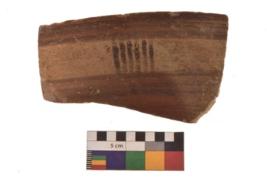 | Description / विवरण | Specimen of Potsherd black on red painted pottery. It is fine fabric in sharp contrast with painted design are executed in black pigment. |