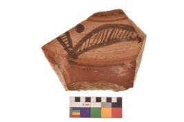| Description / विवरण | Specimen of pipal leaf disign on exterior of thin coarse Red ware potsherd. |