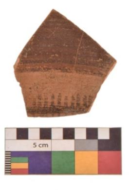 | Description / विवरण | Specimen of Potsherd black on red painted pottery. It is fine fabric in sharp contrast with painted design are executed in black pigment. |