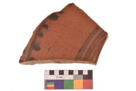 | Description / विवरण | Specimen of Potsherd black on red painted pottery. It is fine fabric in sharp contrast with painted design are executed in black pigment. |
