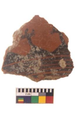 | Description / विवरण | Specimen of black on red ware with black decorative Arch like design with three suspended loops geometric painting. |