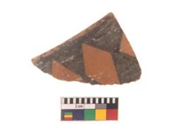 | Description / विवरण | Specimen of black on red ware with black decorative Double axe like design geometric painting. |