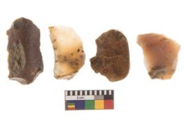 | Description / विवरण | There are n 4 utilized flakes. There are multi directional irregular scar pattern on both dorsal and ventral face of the flakes.two are chert, and two are chalcedony, Some of them are blunted and few are sharp edges. |