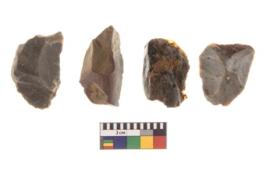 | Description / विवरण | There are n 4 utilized flakes. There are multi directional irregular scar pattern on both dorsal and ventral face of the flakes. three are chert, and one has chalcedony, Some of them are tapering and few are sharp edges. |