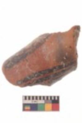 | Description / विवरण | Specimen of black on red ware with black decorative Curved lines geometric painting. |