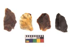 | Description / विवरण | There are n 4 utilized flakes. There are multi directional irregular scar pattern on both dorsal and ventral face of the flakes. three are chalcedony, and one has chart, Some of them are tapering and few are sharp edges. |